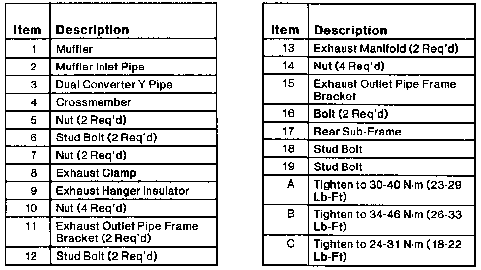 WARNING: The Normal operating temperature of the exhaust system is very high. Never attempt to service any part of the system until it has cooled. Be especially careful when working around the catalytic converter. The temperature of the converter rises to a high level after only a few minutes of engine operation.CAUTION: When servicing exhaust system or removing exhaust components, disconnect all heated oxygen sensors at the wiring connectors to prevent damage to the heated oxygen sensors and wiring harness.