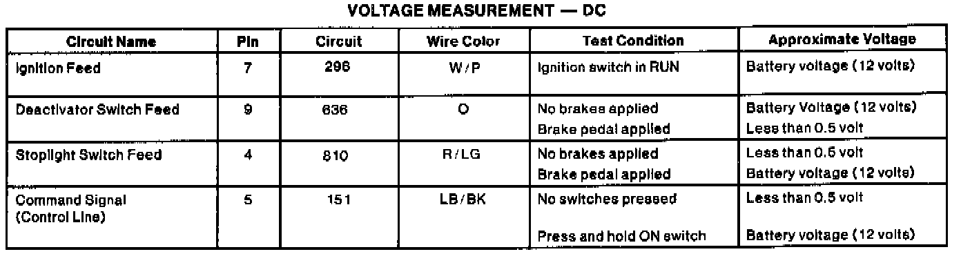 Remove connector from speed control servo. Connect the negative lead of voltmeter to Pin 10 (Circuit 676 [PK/O]) of connector. Measure the DC voltage of the following circuits with positive lead of meter.