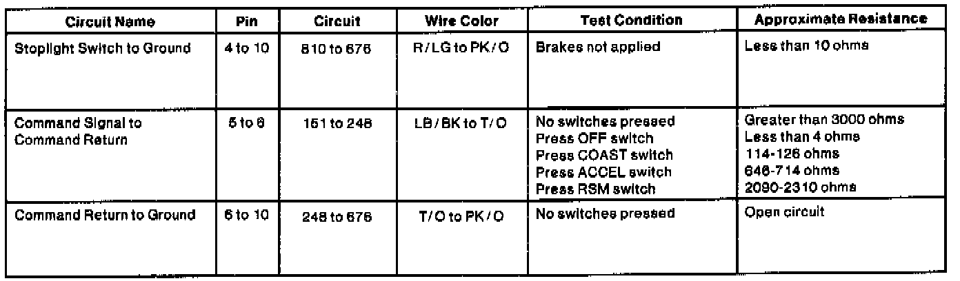Remove connector at speed control servo. Connect an ohmmeter between the designated circuits with ignition switch OFF.