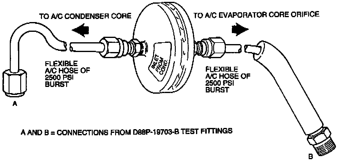 11. Install a pancake filter in the condenser to evaporator tube between the A/C condenser core and the A/C evaporator core orifice. Be sure the filter inlet is toward the A/C condenser core. Connections can be made using A/C Test Adapter Kit D88P-19703-B or equivalent and flexible refrigerant hose of 2500 psi burst rating. Individual fittings are also available.