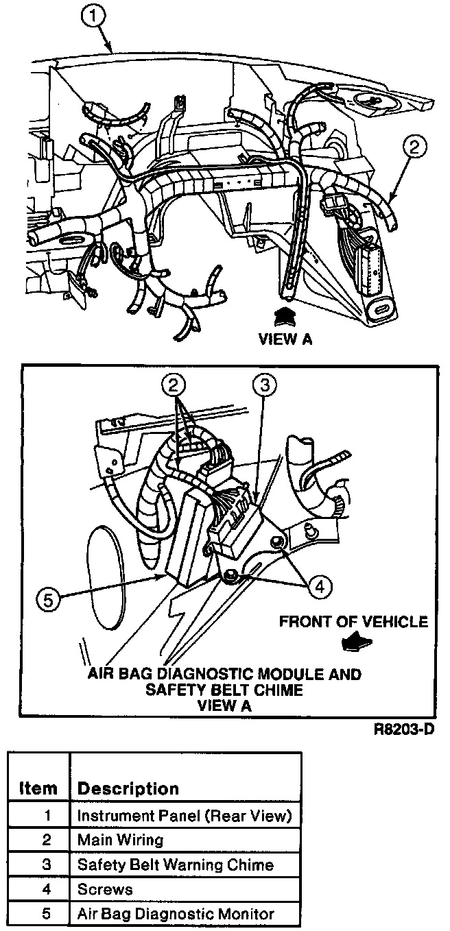 4. Disconnect wiring connectors on air bag diagnostic monitor. Remove air bag diagnostic monitor.