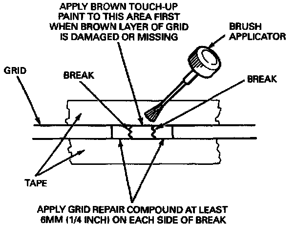 NOTE: If both brown and silver layers of the grid are broken or missing, apply a coat of the brown touch-up paint across the break area first. Two coats may be necessary to obtain the proper color. Allow the touch-up paint to dry, then apply three coats of silver grid repair compound, allowing three to five minutes drying time between coats. The coating of the silver grid repair compound should extend at least 6 mm (1/4 inch) on each side of the break area.