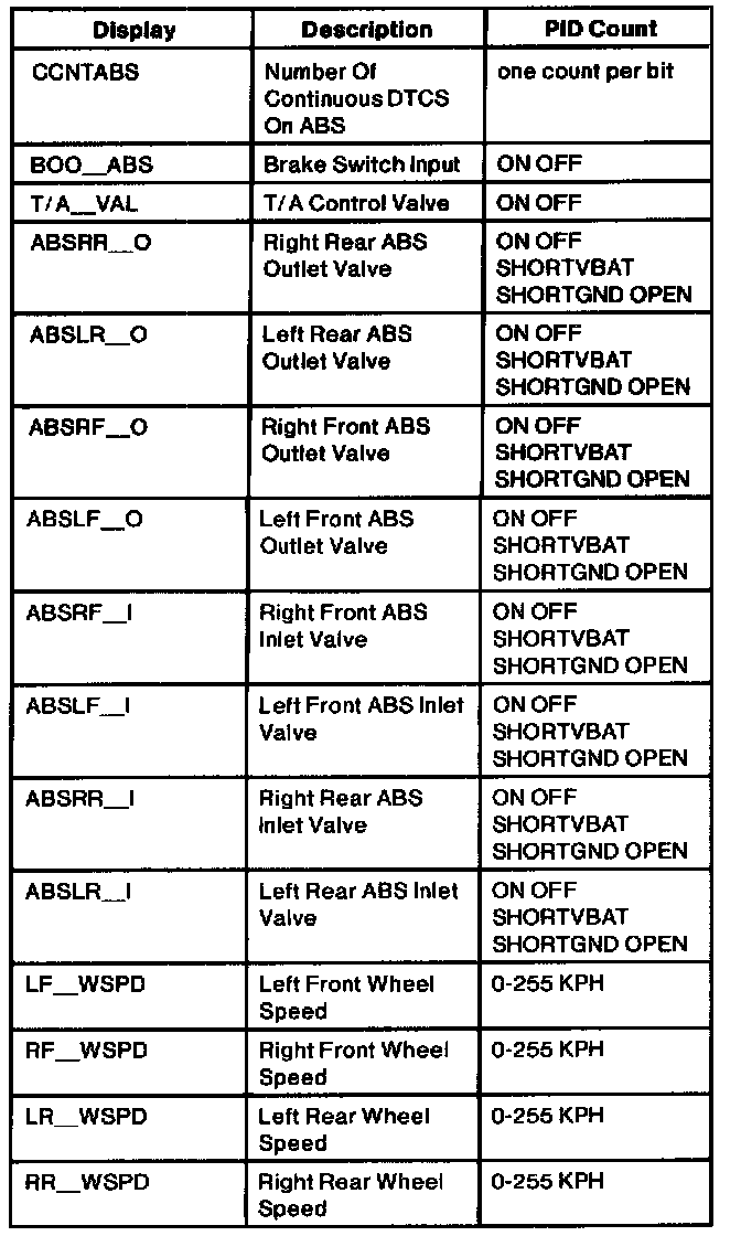 (ABS) Control Module Parameter Identification (PID) Index