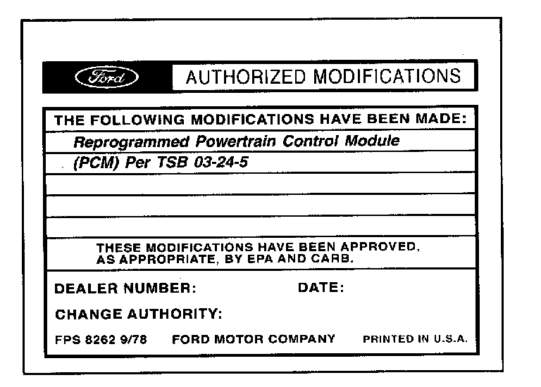 Obtain an Authorized Modifications Decal (FPS 8262 - obtainable through DOES II, 25/pkg) and list the date, dealer number, and summary of modifications performed. Select a prominent place adjacent to the Vehicle Emission Control Information Decal suitable for installing the Authorized Modifications Decal. Clean the area, install the decal, and cover it with a clear plastic decal shield.
