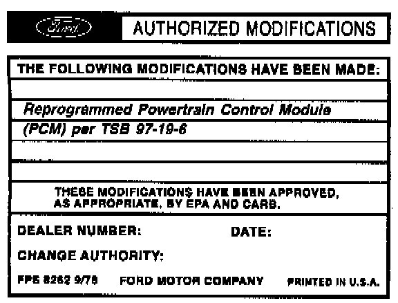 Obtain an Authorized Modification Decal (FPS 8262 - obtainable through DOES II, 25/pkg) and list the date, dealer number, and summary of modifications performed. Select a prominent place adjacent to the Vehicle Emission Control Information Decal suitable for installing the Authorized Modifications Decal. Clean the area, install the decal, and cover it with a clear plastic decal shield.