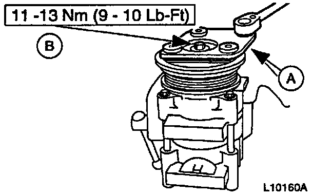 7. Use the (A) Compressor Clutch Holding Tool to install a new (B) A/C clutch bolt.