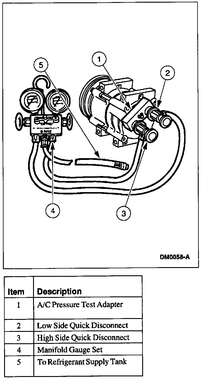4. Connect the high and low pressure lines of the manifold gauge set to the corresponding fittings on the A/C pressure test adapter.