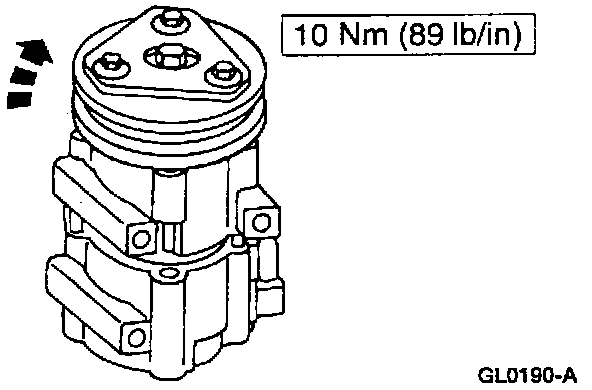 3. Rotate the A/C compressor shaft clockwise. Note the torque required to rotate the shaft one complete rotation. Verify that the noted torque is less than specification.
