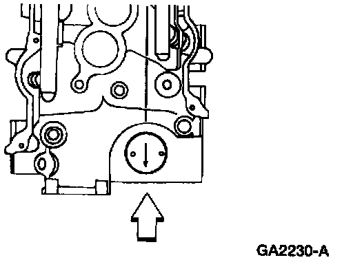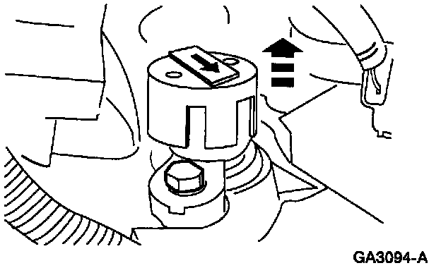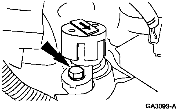 3. When installing the camshaft synchronizer into the cylinder block, make sure that the arrow on the Synchronizer Positioning Tool is pointing toward the rear of the vehicle.