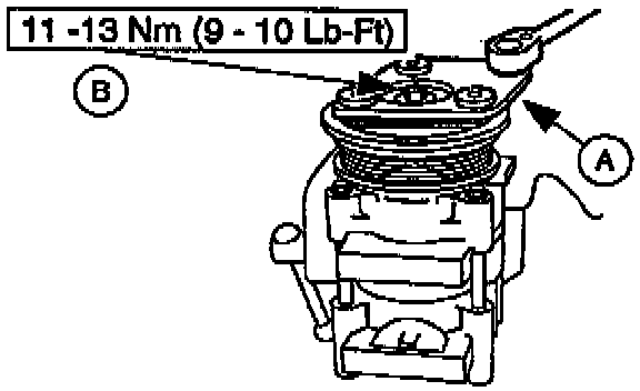 7. Use (A) Compressor Clutch Holding Tool to install a new (B) A/C clutch bolt.