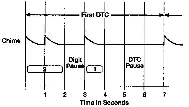 The Central Timer Module (CTM)'s Diagnostic Trouble Codes (DTCs) are 2 digits in length and are output to the operator by the sounding of the chime.The first digit is output, followed by a one second pause, followed by the next digit. Each digit is made up of 1 to 9 one-second individual chime tones. The illustration represents the output of the DTC 21.