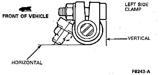 b. After setting toe, the clamp bolt/nut on the left (drag link) adjusting sleeve must be positioned within a limit of 45 degrees (plus/minus) as shown with the threaded end of the bolt pointing forward.