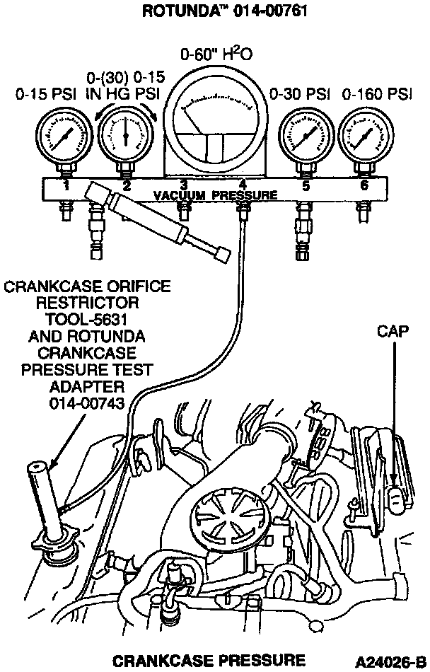 Screw the Crankcase Orifice Restrictor Tool P/N 5631 and Rotunda Crankcase Pressure Test Adapter 014-00743 or equivalent in the oil fill cap hole. Plumb to the Magnehelic gauge in the gauge block. Make sure the Magnehelic gauge has been zeroed.