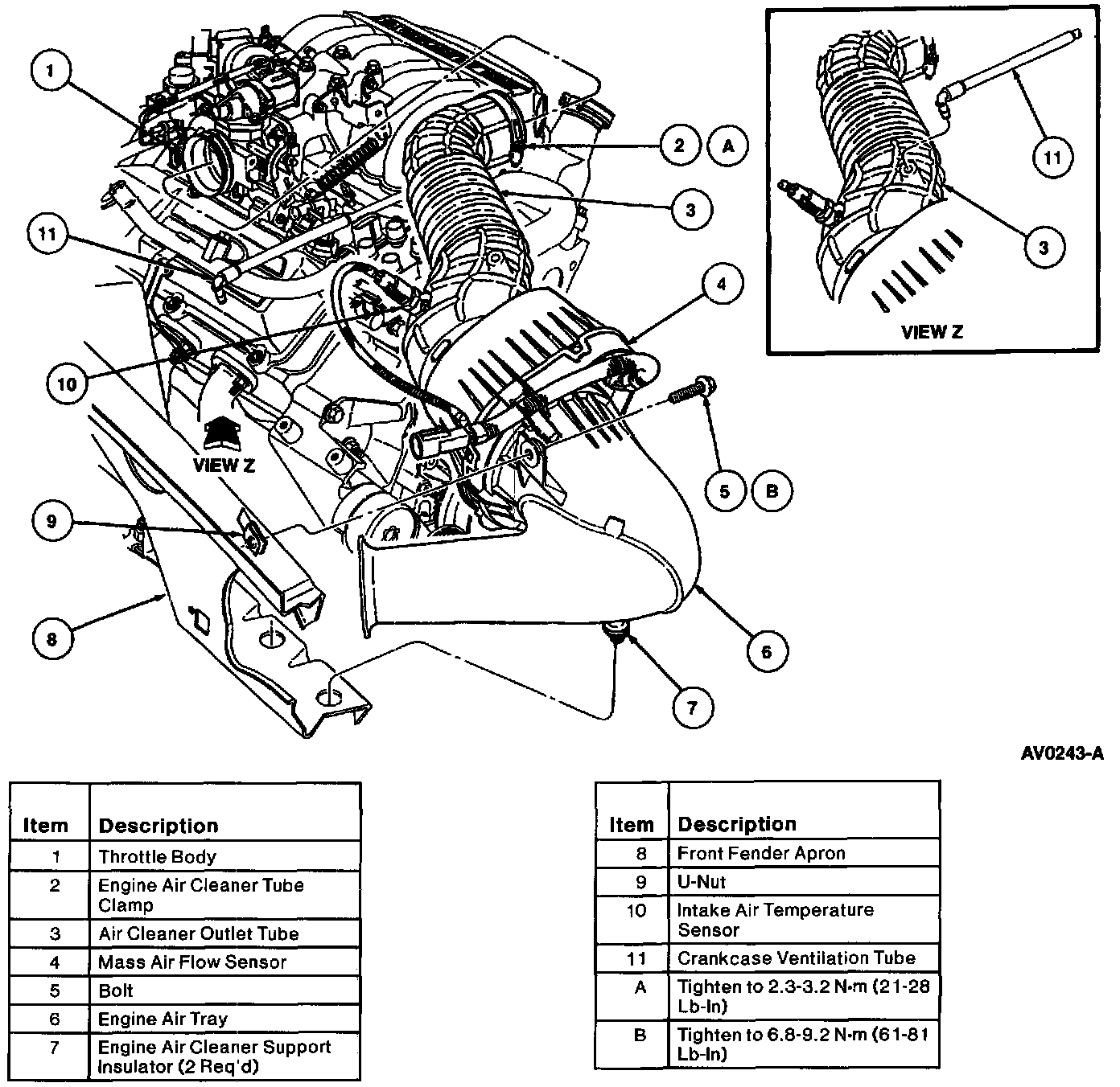 9. Connect wire harness to mass air flow sensor and intake air temperature sensor. Tighten engine air cleaner tube clamp to 2.3-3.2 N.m (21-28 Lb-In).
