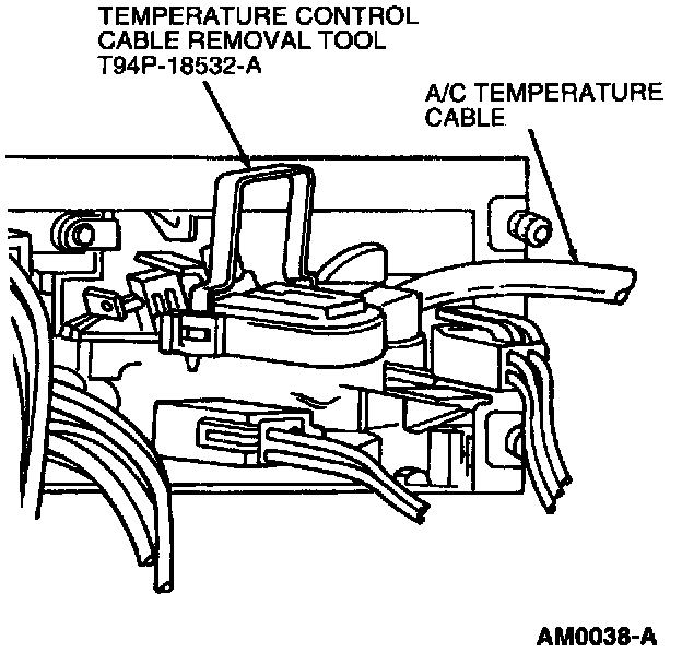4. Disconnect A/C temperature cable from the back of the heater control using Temperature Control Cable Removal Tool T94P-18532-A to release side locking tube and a small flat blade screwdriver to release the top locking tab. Pull A/C temperature cable away from the heater control.