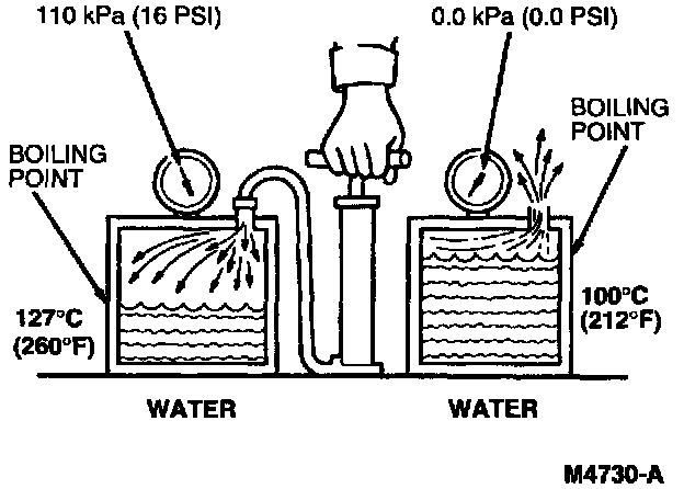 Another effect of compression is an increase in temperature even though heat has not been added. For example, if refrigerant R-134a vapor is compressed from 206 kPa (30 psi) to 1206 kPa (175 psi), the vapor temperature will increase from 0°C (32°F) to 54°C (130°F) and the boiling/condensation point will also increase.