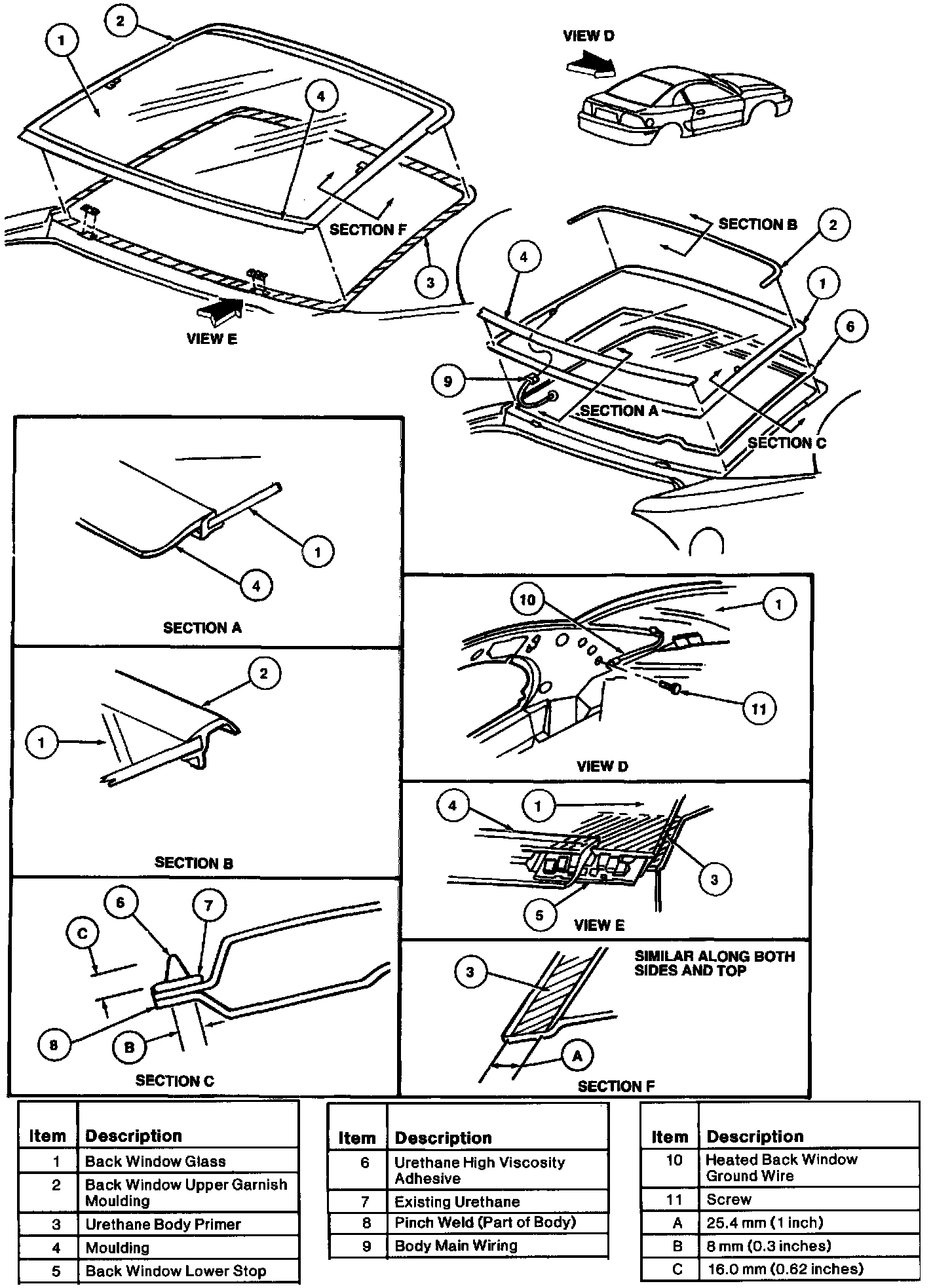 CAUTION: When replacing urethane installed glass parts, do not drive the vehicle until the urethane has cured. At temperatures above 13°C (55°F) and relative humidities above 50%, adequate cure time is typically 12 to 24 hours (less at higher temperatures and lower humidities). See detailed instructions provided by the urethane manufacturer. Inadequate or improper curing may adversely affect the retention of the back window glass.