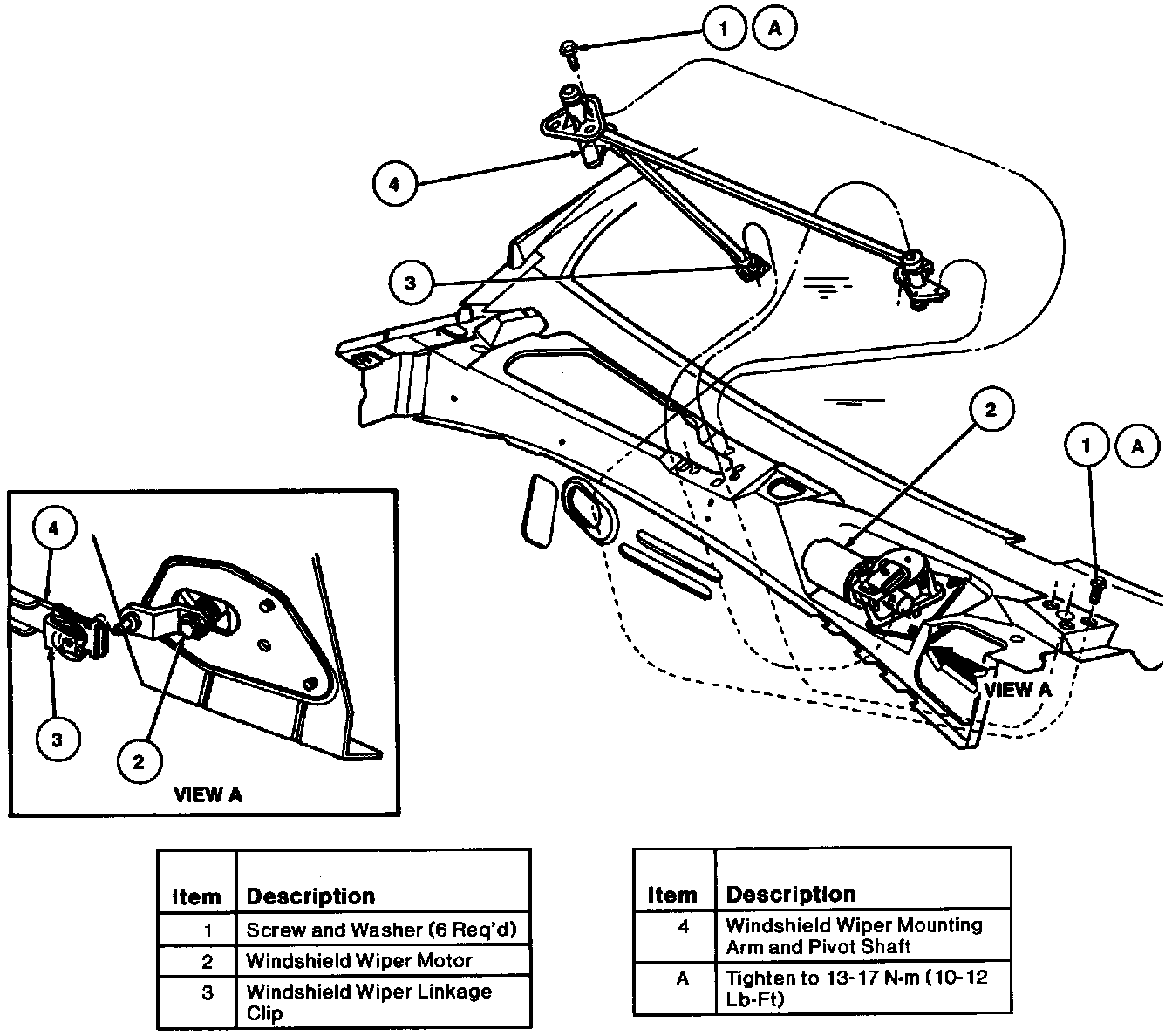 1. To install, reverse removal procedure. Tighten six screws retaining windshield wiper mounting arm and pivot shafts to 13-17 N.m (10-12 Lb-Ft).