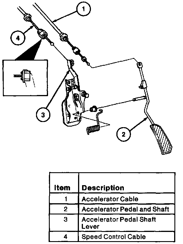 REMOVAL1. Remove the speed control cable end from the accelerator pedal shaft lever by squeezing the tabs together and pulling the speed control cable through.