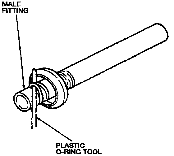 4. Remove the O-ring seals from the male fining using Plastic O-ring Tool F5VH-17B017-AA or equivalent. Do not use a metal O-ring tool. They could cause axial scratches across the O-ring grooves resulting in refrigerant leakage.