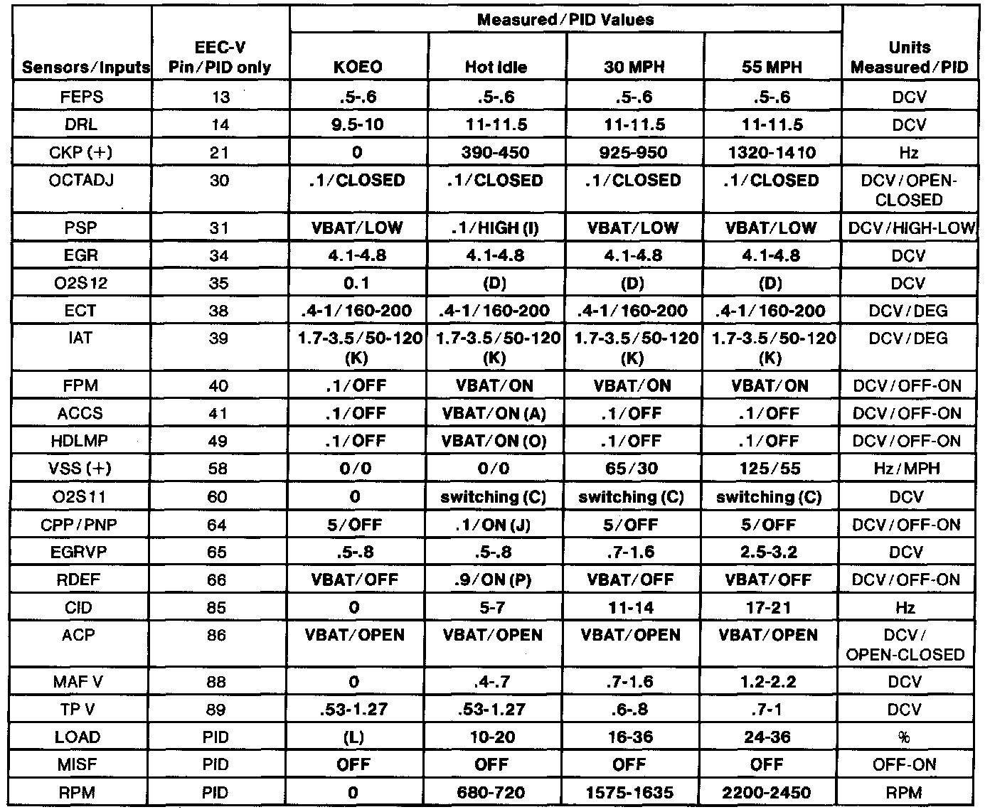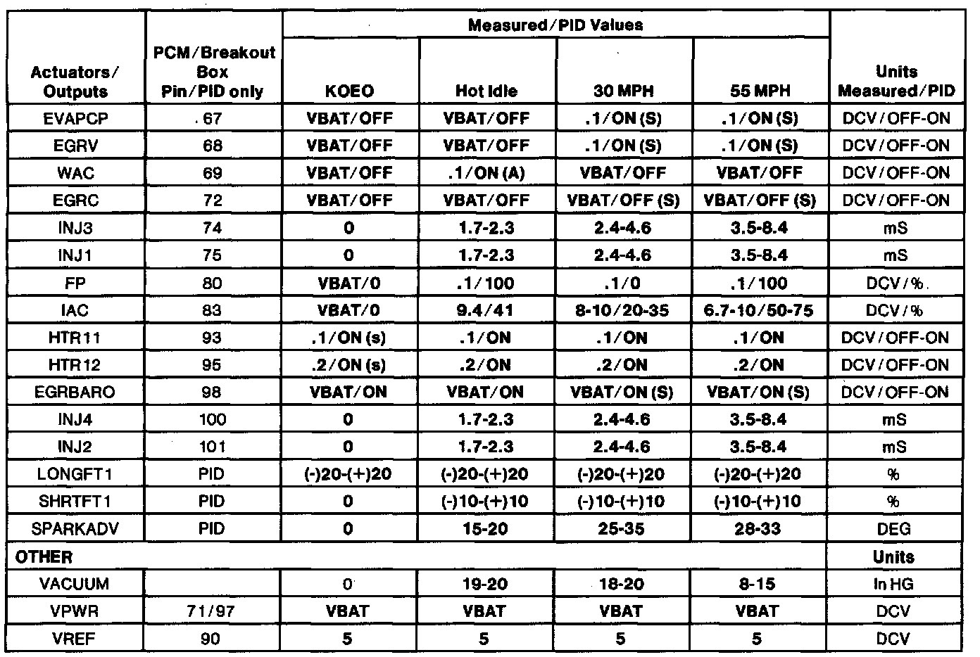 Normal Scan Data Values - Includes Pids