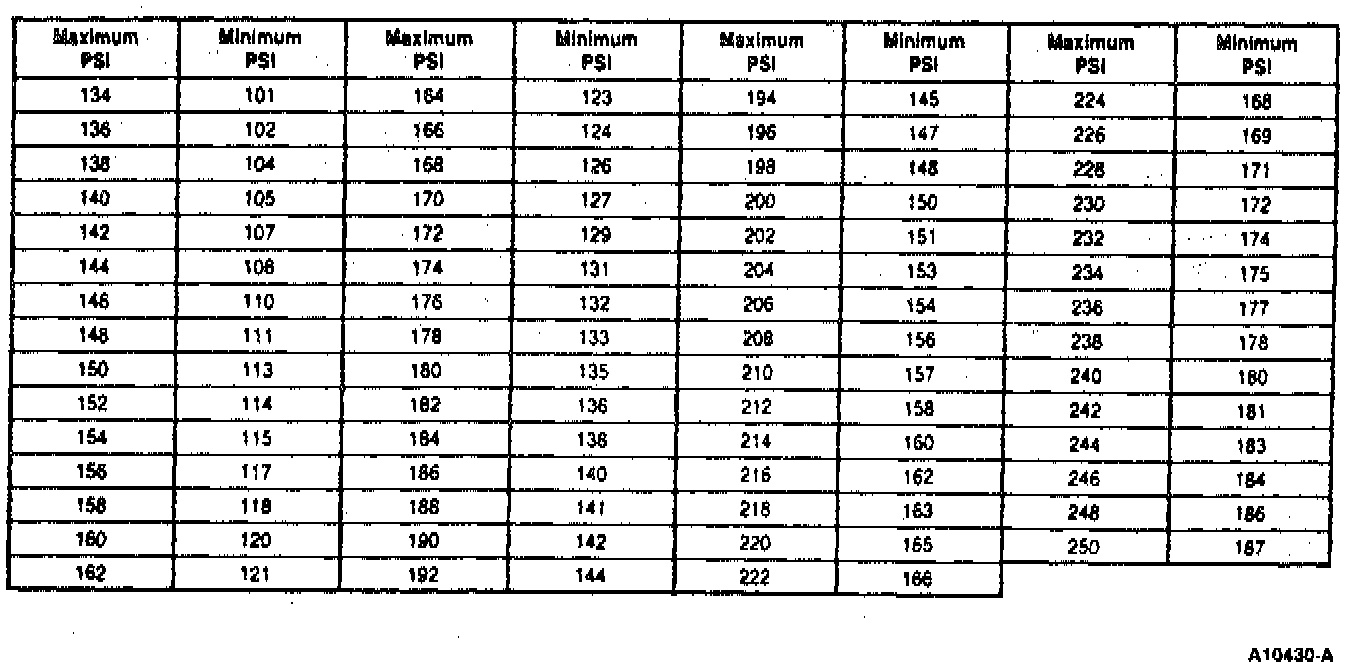 Example: If the highest cylinder reads 924 kPa (134 psi) and the lowest cylinder reads 696 kPa (101 psi), then the 696 (101) reading is within 75 percent of the 924 (134) reading. The above chart shows maximum compression readings and their corresponding 75 percent minimums.