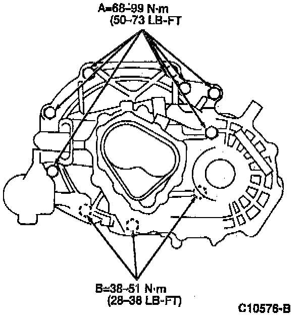 4. Connect the engine and transaxle. Tighten the engine-to-transaxle (A) bolts and transaxle-to-engine (B) bolts as shown.