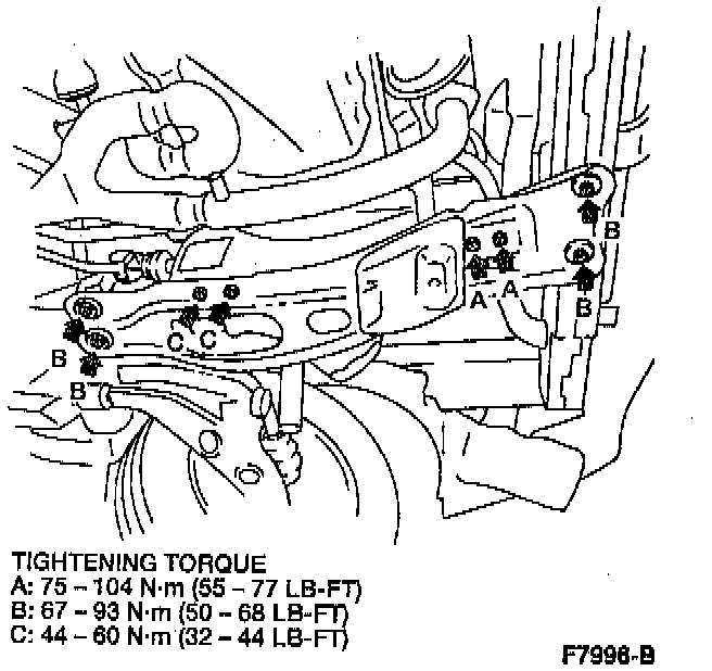 23. Install the crossmember. Tighten the crossmember bolts to 94-126 Nm (69-93 ft. lbs.).