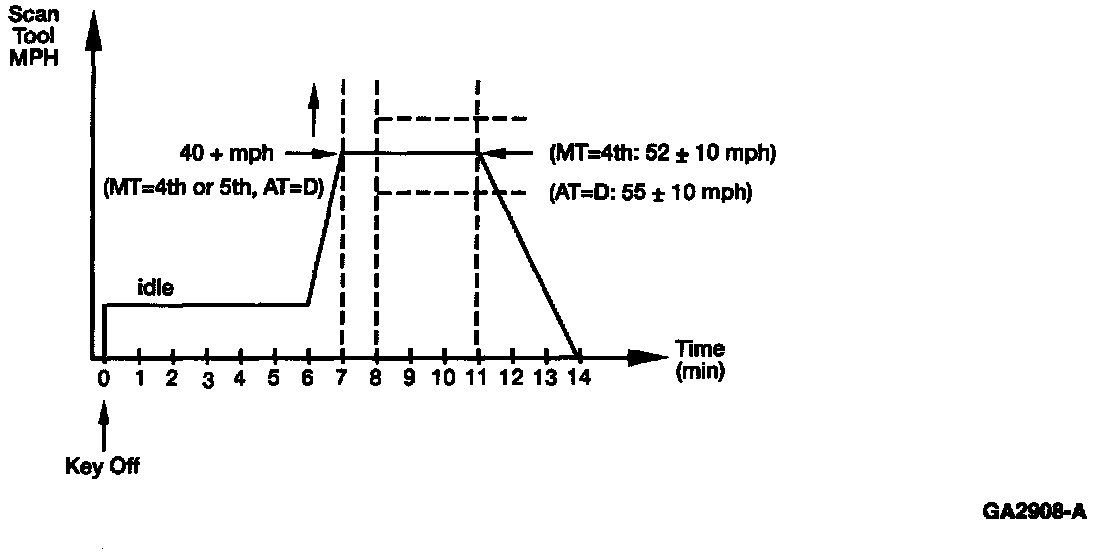 - 75-101 kph (47-65 mph) for A/T or 71-77 kph (44-60 mph) for M/T (4th gear) as indicated by the speedometer. Drive at this pattern for at least 20 seconds.
