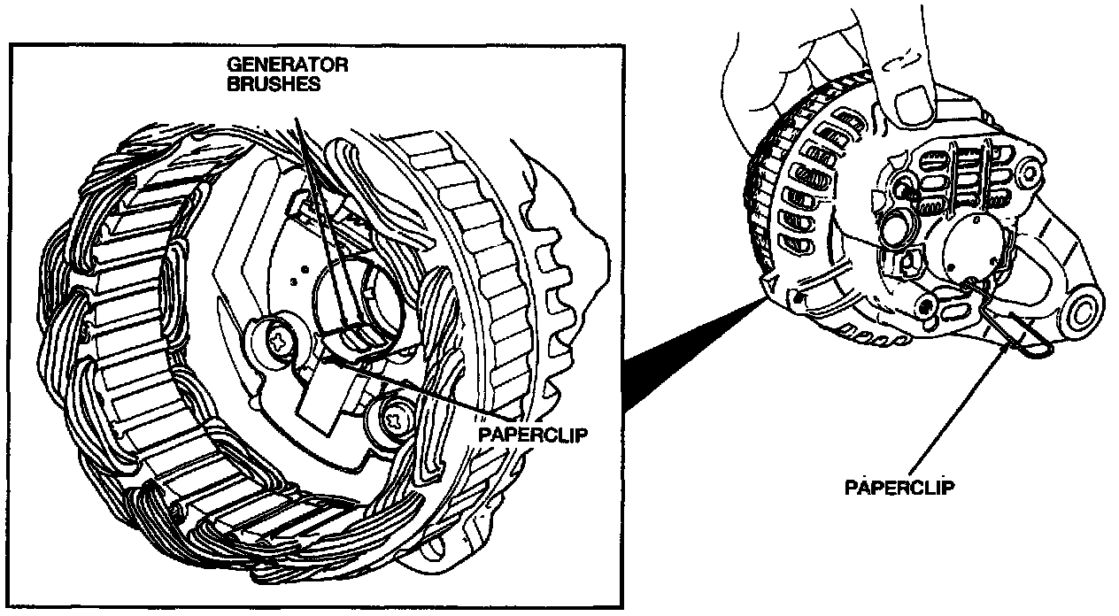 7. Depress the generator brushes. Use a stiff wire (a straightened paper clip will work) to retain the generator brushes in the voltage regulator while assembling the generator.