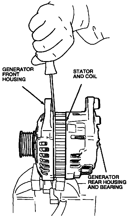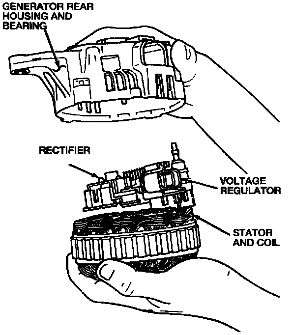 13. Remove the stator and coil, with the voltage regulator and rectifier attached, from the generator rear housing and bearing.