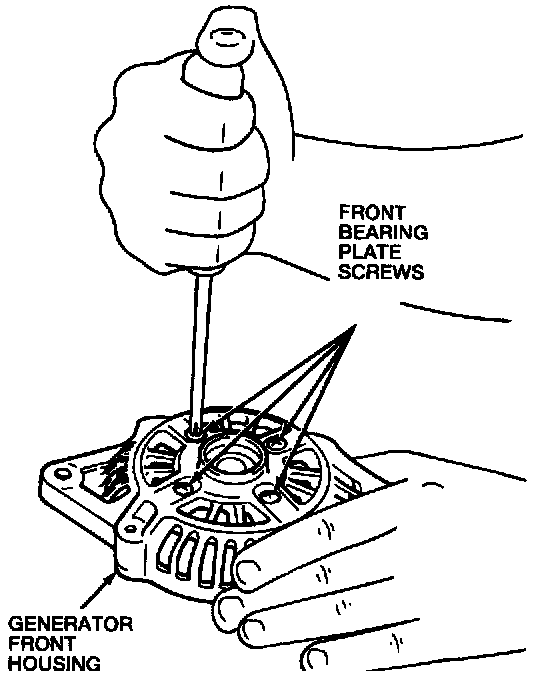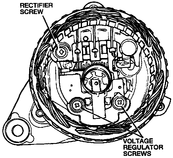 12. Remove the rectifier screw and the two voltage regulator screws that secure the voltage regulator (VR) and rectifier to the generator rear housing and bearing.