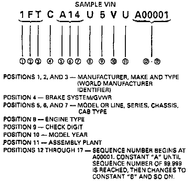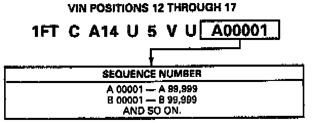 Digits twelve through seventeen make up the sequence and warranty number. Digit twelve uses the letter "A" until the production or sequence of 99,999 units (digits thirteen through seventeen) is reached. Letter A then becomes B for the next production sequence of vehicles.