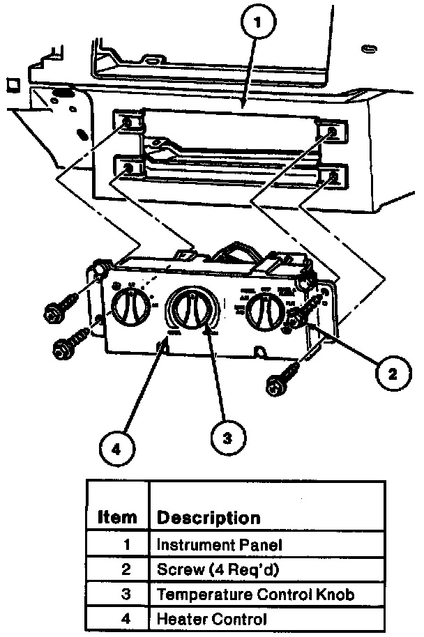 A heater temperature cable connects the temperature control knob to a cam which operates the temperature blend door. When the temperature control knob is at the COOL position, the temperature blend door directs outside air to bypass the heater core. When the temperature control knob is at WARM, the temperature blend door directs outside air through the heater core where the air is heated.