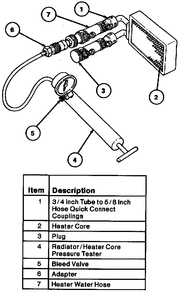 2. Connect the 101.6 mm (4 in) test heater water hoses with plug and adapter to the core tubes. Then connect Rotunda Radiator/Heater Core Pressure Tester or equivalent to the adapter.