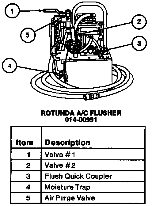 CAUTION: This Rotunda A/C Tool Flusher 014-00991 is intended for use with only Ford A/C Flushing Solvent F4AZ-19579-A or equivalent. Use of any other flushing solvent or agent may cause damage to the flusher. Substitute solvents or agents may not be removed during the purging process and may leave residues which can damage A/C system components.