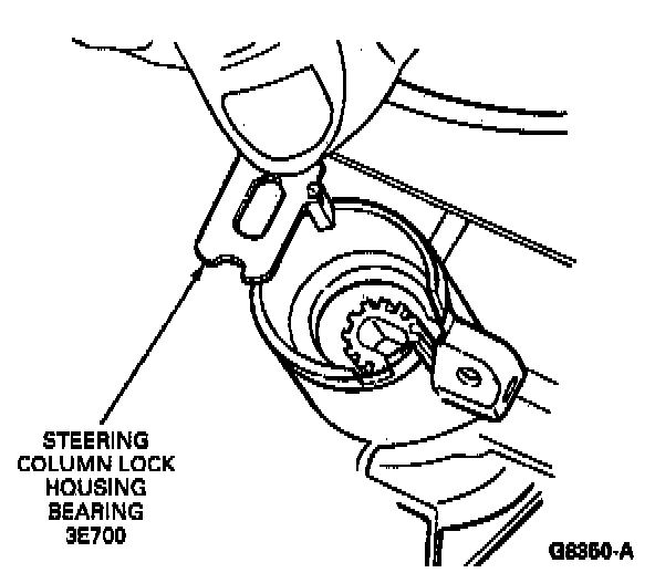 2. Remove column lock gear retainer by inserting a screwdriver or similar tool, with a 90 degree bend on the tip, between steering column upper bearing retainer and steering column lock housing bearing and by prying upward.