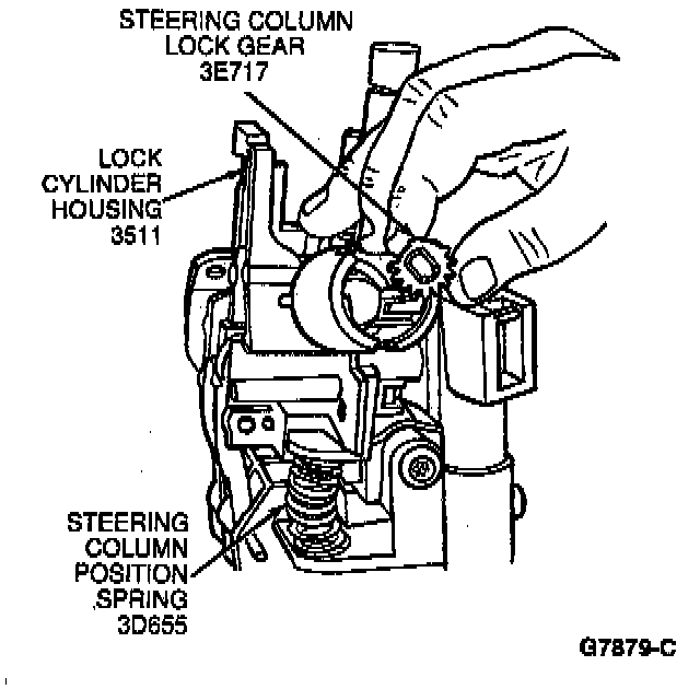 1. Position steering column lock gear in base of lock cylinder housing in the same position as that noted during removal procedure. The position of steering column lock gear is correct if last tooth on steering column lock gear is meshed with last tooth on steering column lock lever actuator.
