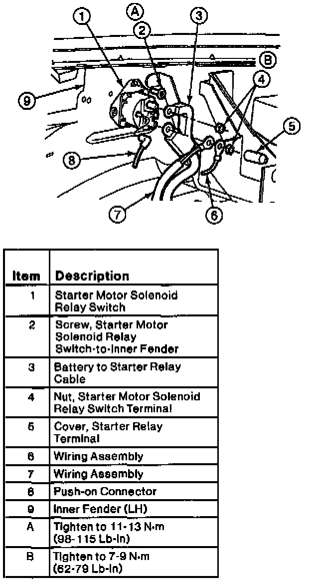 2. Tighten the starter motor solenoid relay switch-to-inner fender screws to 11-13 Nm (98-115 Lb-In).