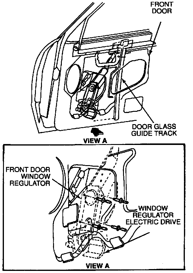 6. Remove three screws retaining front door window regulator to window regulator electric drive.