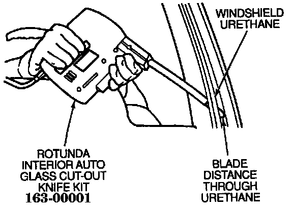 NOTE: Be careful to cut through urethane in corner of windshield glass, where urethane is thicker.