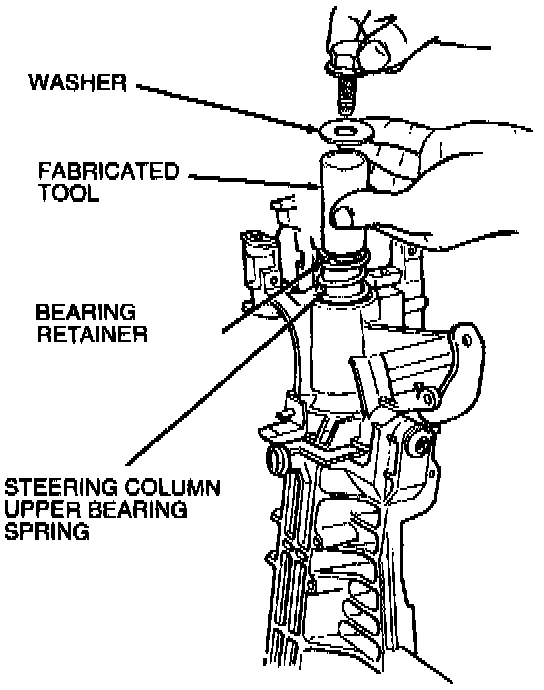 16. Install steering column upper bearing spring and new bearing retainer on top side of steering column upper bearing spring using a 3/4-inch by 2-3/8 inch PVC pipe. Screw down bolt until bearing retainer snaps into groove.