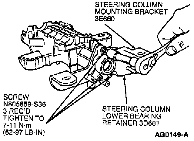 1. Install steering gear input worm gear and rack into steering actuator housing.2. Install lower steering column bearing and steering column mounting bracket. Tighten screws to 7-11 Nm (62-97 inch lbs).