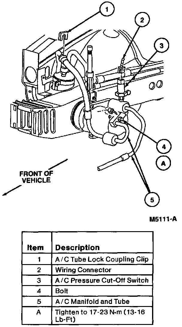 11. Position A/C manifold and tube with O-ring seals to A/C compressor. Install retaining bolt and tighten to 17-23 N.m (13-16 lb-ft).