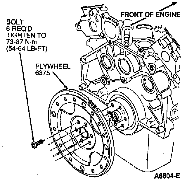 2. Position flywheel on the crankshaft and install retaining bolts. Tighten bolts to 73-87 Nm (54-64 ft. lbs.) using the standard cross-tightening sequence.