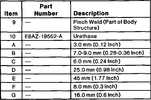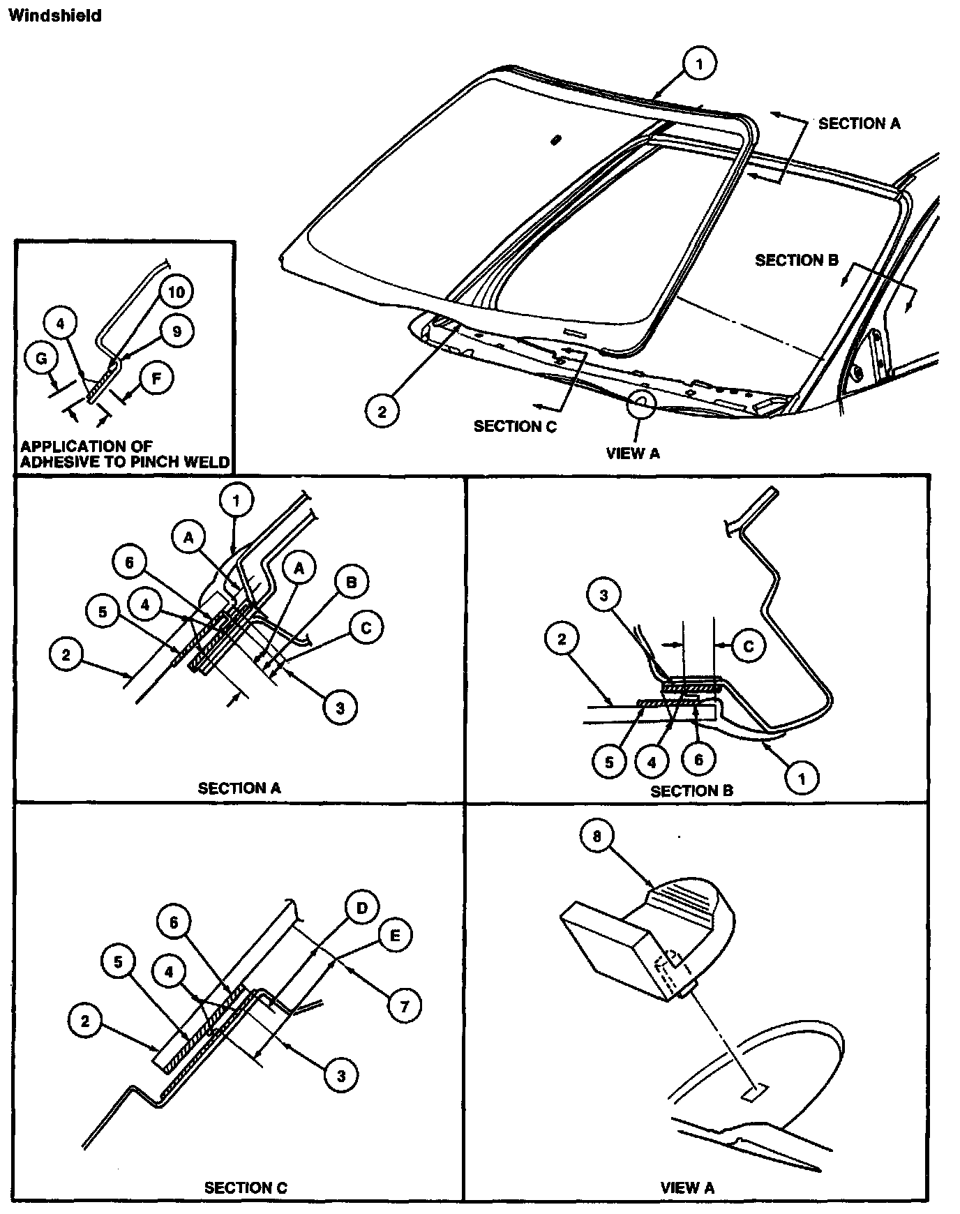 Apply an even bead of Urethane Adhesive WSB-M2G316-B or equivalent around entire sheet metal pinch weld next to windshield moulding retaining leg. The bead should be triangular in shape, 16 mm (0.625 inch) high and 8 mm (0.33 inch) at base. Apply a double bead of urethane along the cowl top and the bottom of windshield opening.