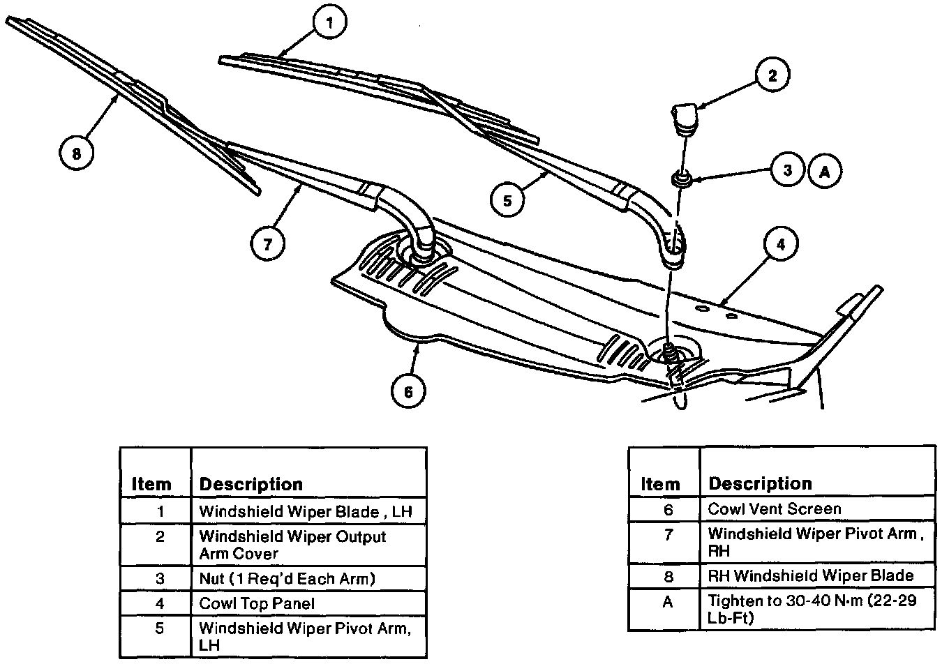 3. Install nut retaining windshield wiper pivot arm to pivot shaft and tighten to 30-40 Nm (22-29 Lb-Ft).