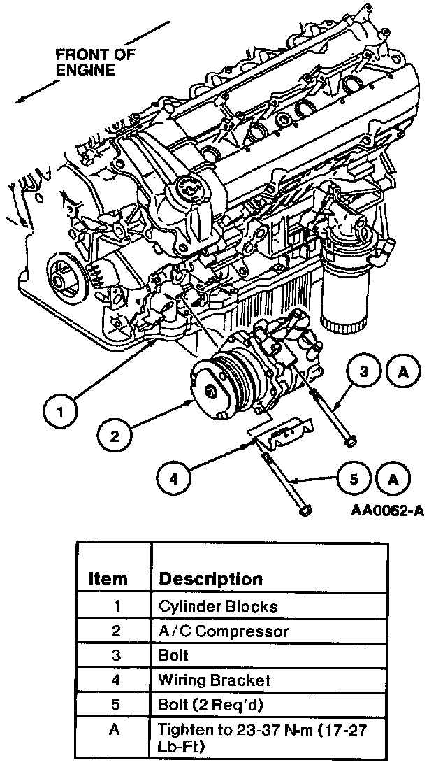 6. Position A/C manifold and tube with O-ring seals onto A/C compressor. Install retaining bolt and tighten to 17-23 N.m (13-16 lb-ft).