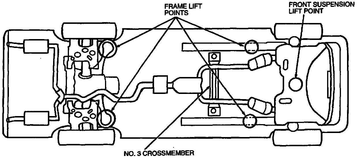 When using a floor jack, the vehicle may be raised at several locations. The front of the vehicle may be lifted by positioning the floor jack under the center of the No. 2 crossmember. The front, as well as either side of the rear end, may be lifted by positioning the floor jack under the rocker flange at the contact points used for the service jack supplied with the vehicle.