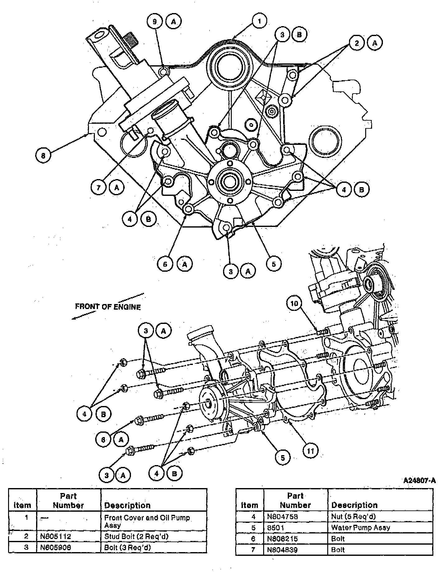 NOTE: Gasket and Trim Adhesive D7AZ-19B508-B or equivalent meeting Ford specification ESE-M2G52-A is recommended to hold the engine front cover gasket in position while the engine front cover is installed.